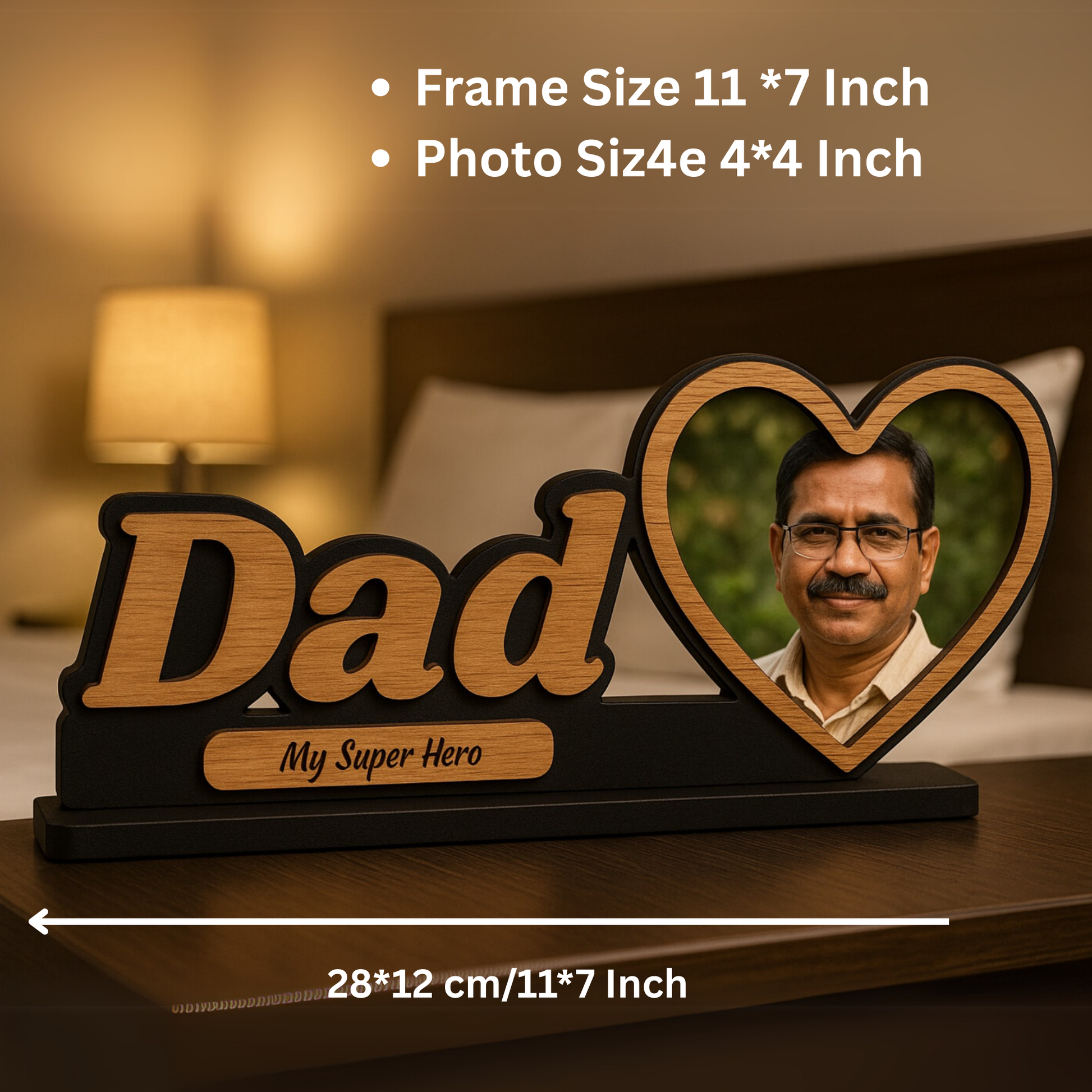 This elegant custom photo frame for Dad is made from high-quality engineered wood and features a personalized name cutout (e.g., Dad, Papa, or his name), a heart-shaped element, and a portrait photo slot engraved with “Happy Birthday” or any custom text on request.