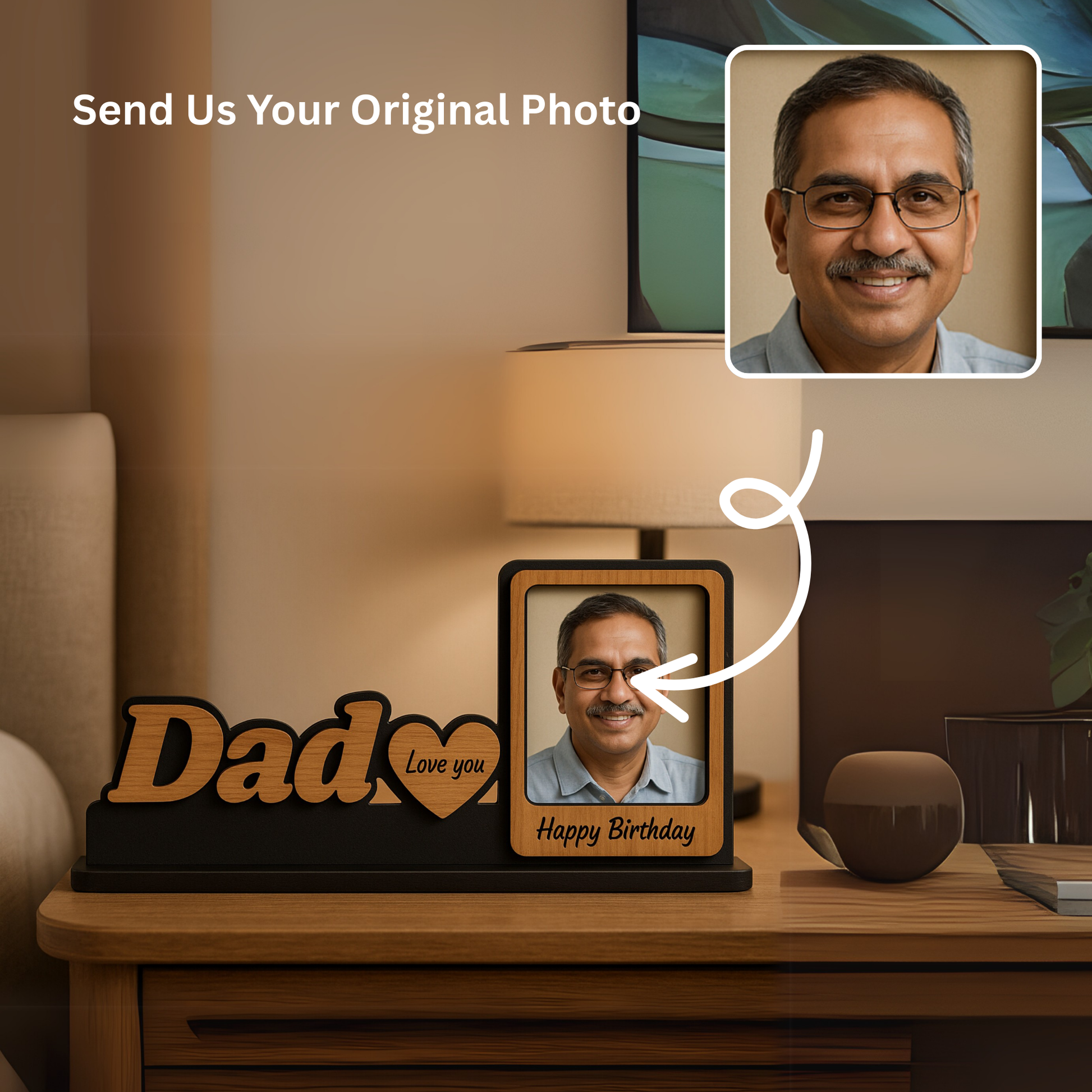 This elegant custom photo frame for Dad is made from high-quality engineered wood and features a personalized name cutout (e.g., Dad, Papa, or his name), a heart-shaped element, and a portrait photo slot engraved with “Happy Birthday” or any custom text on request.