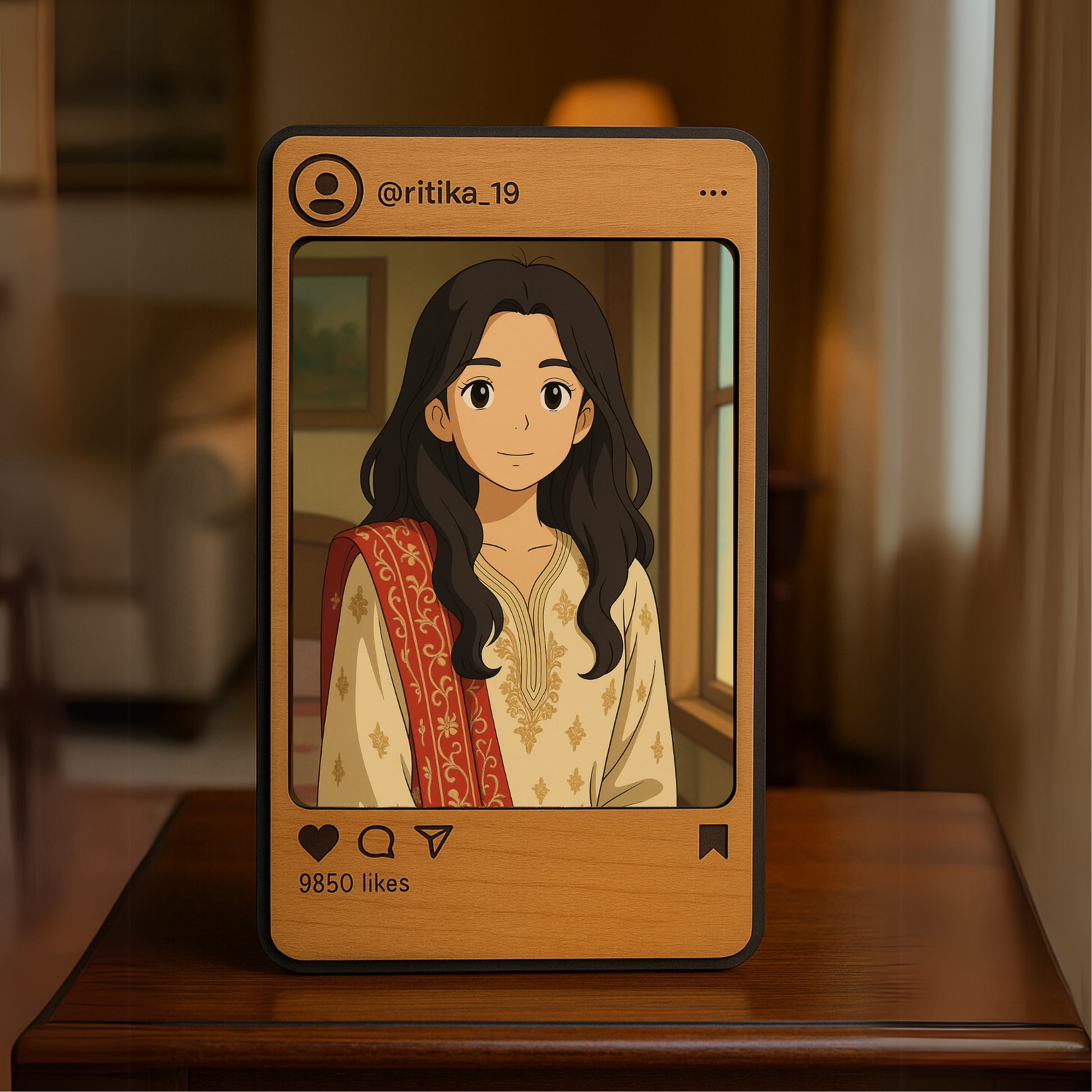 Introducing the Trending Instagram Style Customized Photo Frame with your photo transformed into Ghibli-style illustration, displayed beautifully on a premium black MDF base with an engraved wooden top layer.