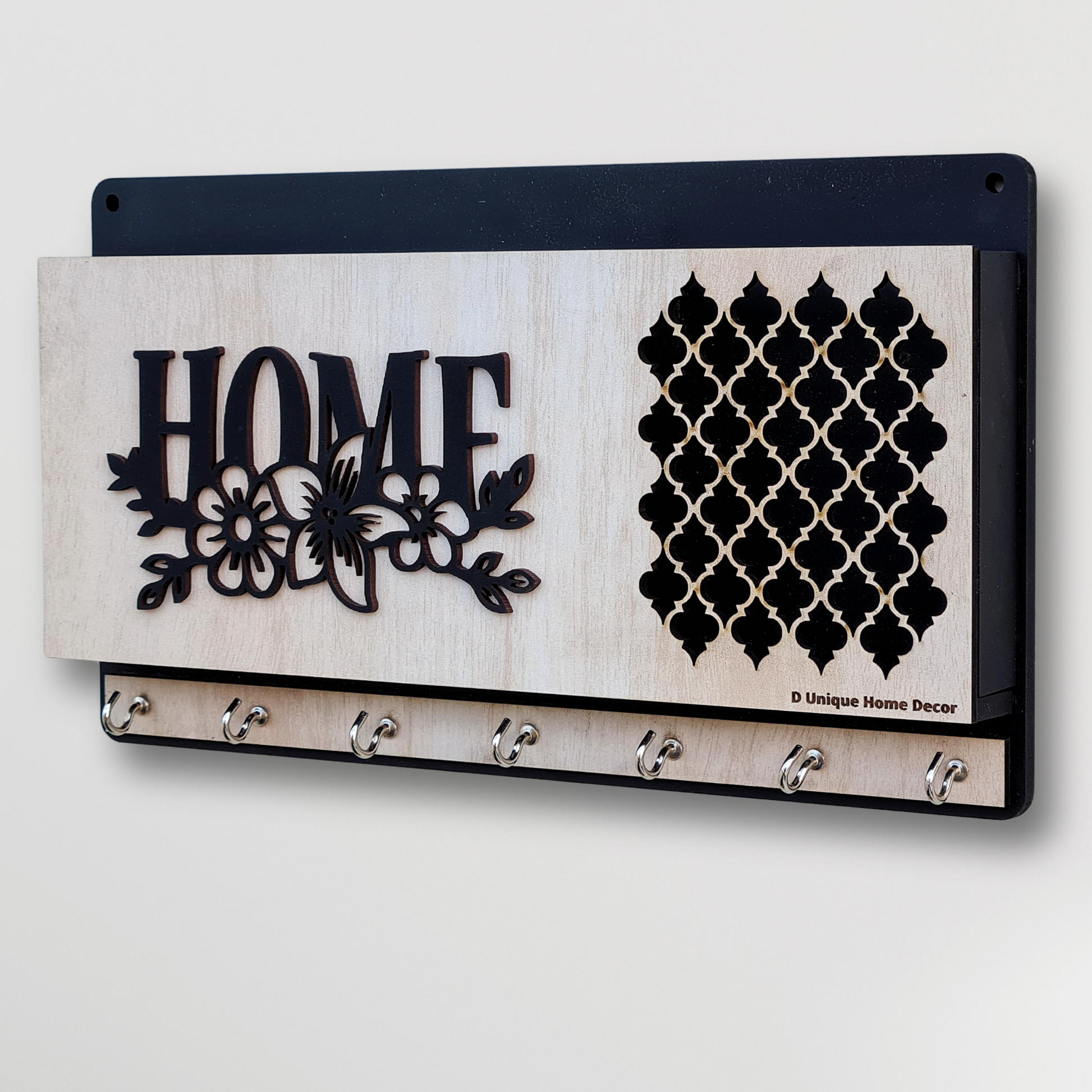 Say goodbye to misplaced keys with our modern wall mount key holder by Dandjdecor.in. Crafted from 6mm premium MDF, this laser-cut wooden key holder features the word "HOME" with elegant floral cutouts, making it a decorative piece and practical organizer in one.